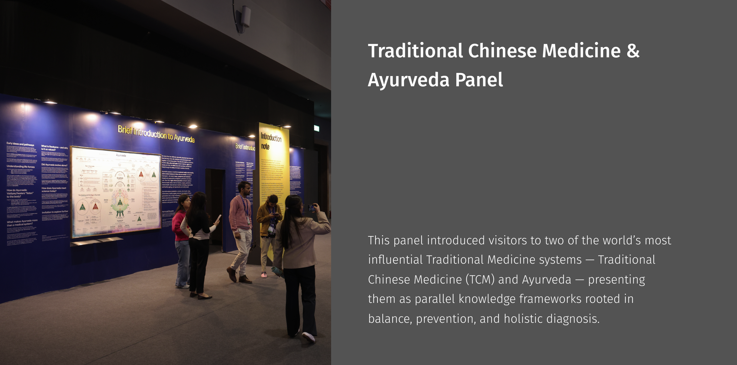 cultures — from Indigenous medical practices and early material medical to modern biomedical frameworks. Through layered graphics, archival imagery, and data overlays, the wall positioned Traditional Medicine not as an alternative, but as a foundational knowledge system that has continuously informed global health.