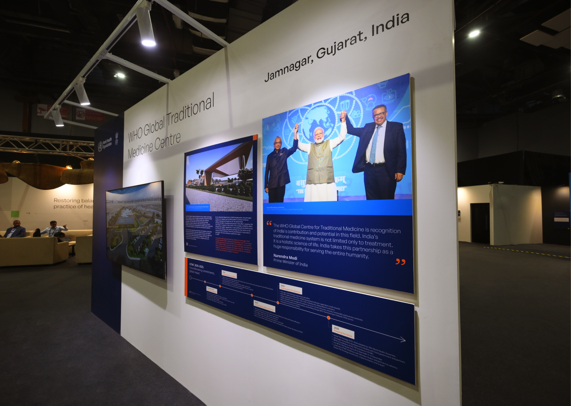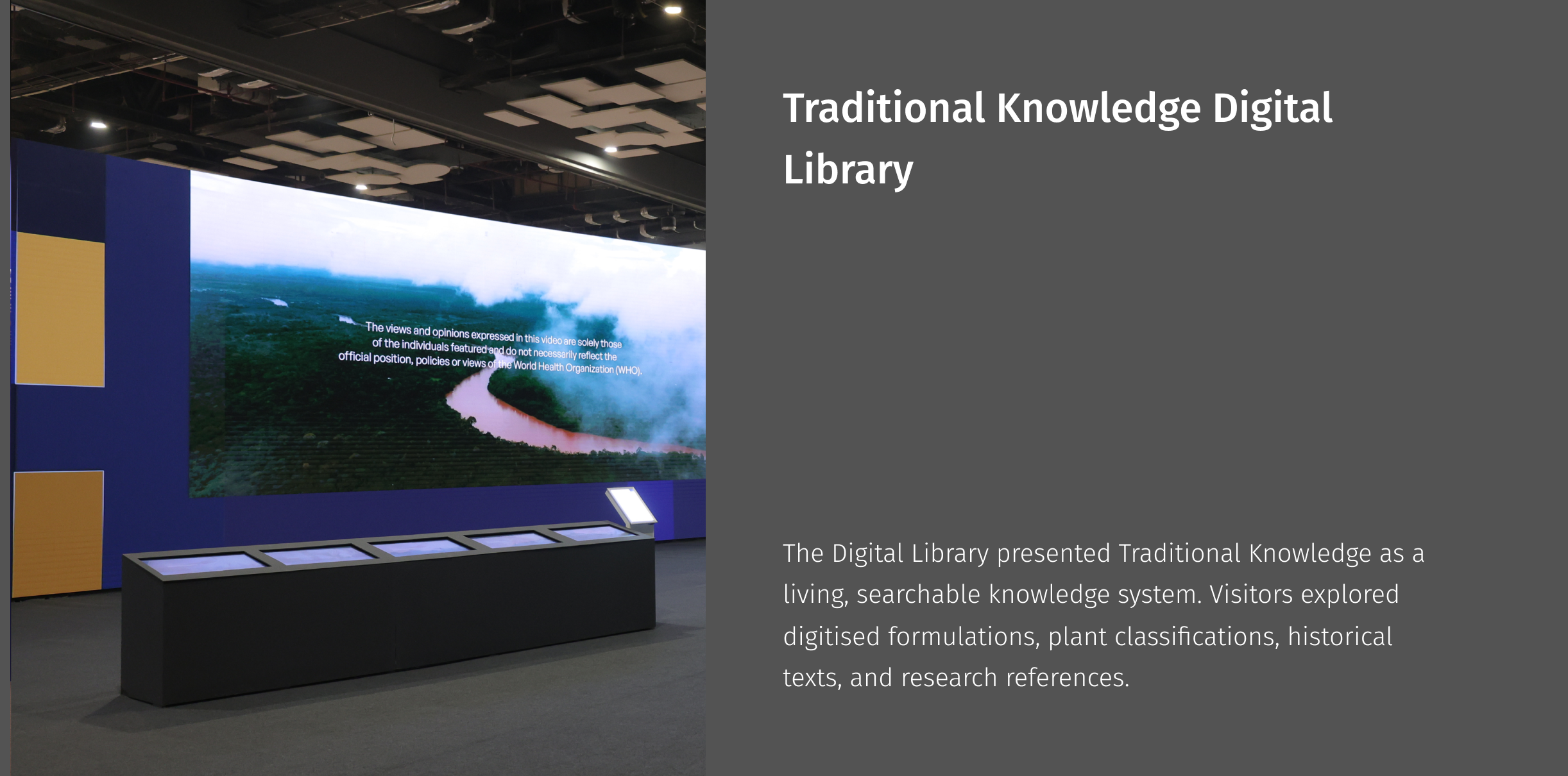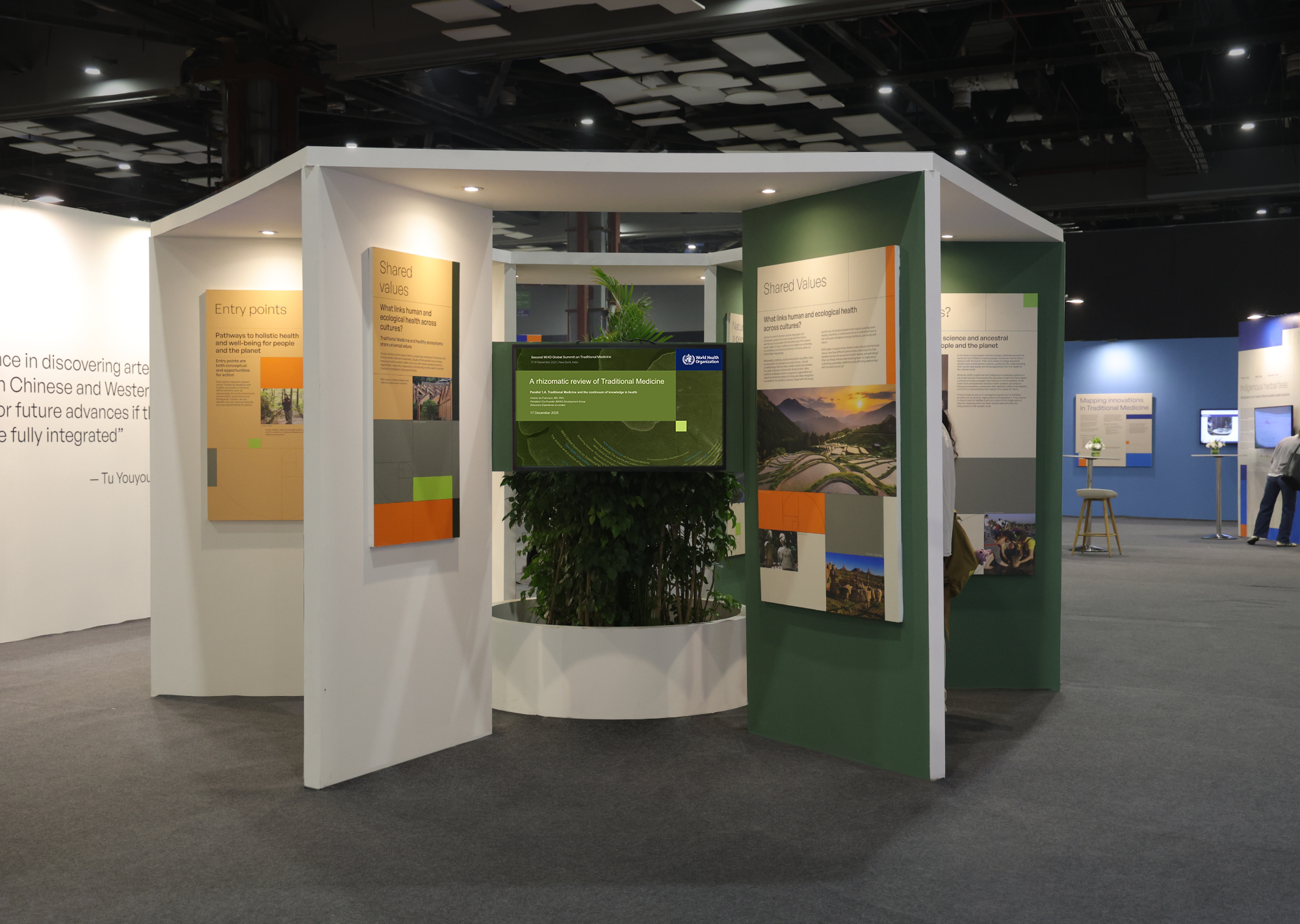 This section translated complex global knowledge systems into a spatially legible experience. Dense research, policy frameworks, innovation showcases, and participatory tools were structured through modular displays, digital layers, and clear hierarchies. The design balanced authority with accessibility—allowing visitors to engage with data, contribute perspectives, and explore future pathways of Traditional Medicine without cognitive overload.